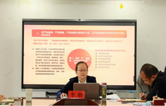 李勤以《坚持严的基调,勇于自我革命,在新征程上推进全面从严治党》为主题,通过违规违纪的真实案例,以案明纪、以案说法。她强调,管党治党一刻也不能放松,决不能有松劲歇脚、疲劳厌战的情绪,更不能有降调变调的错误期待;要把严的基调、严的措施、严的氛围长期坚持下去,以严明纪律护好学校风清气正的政治生态;全面从严治党,要坚持问题导向,保持战略定力,勇于自我革命,永远吹冲锋号。
