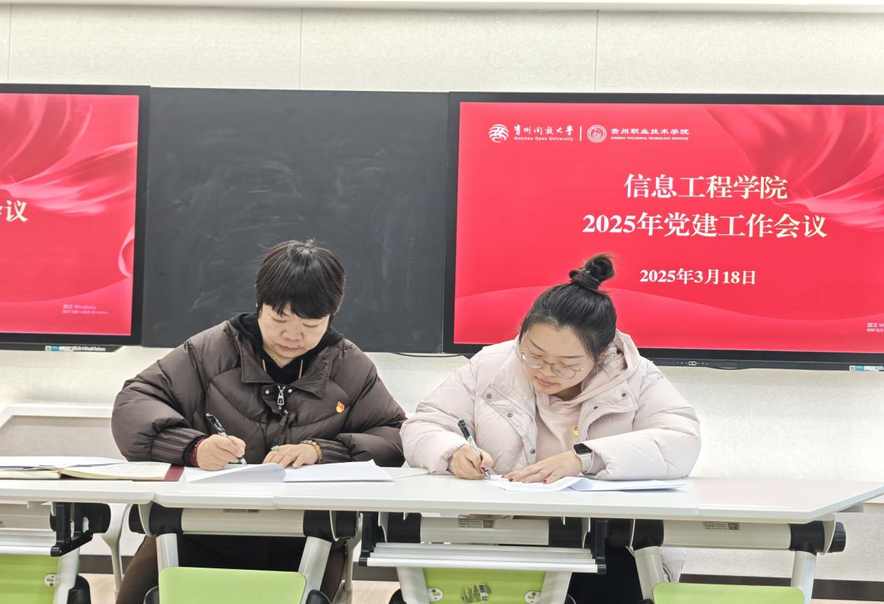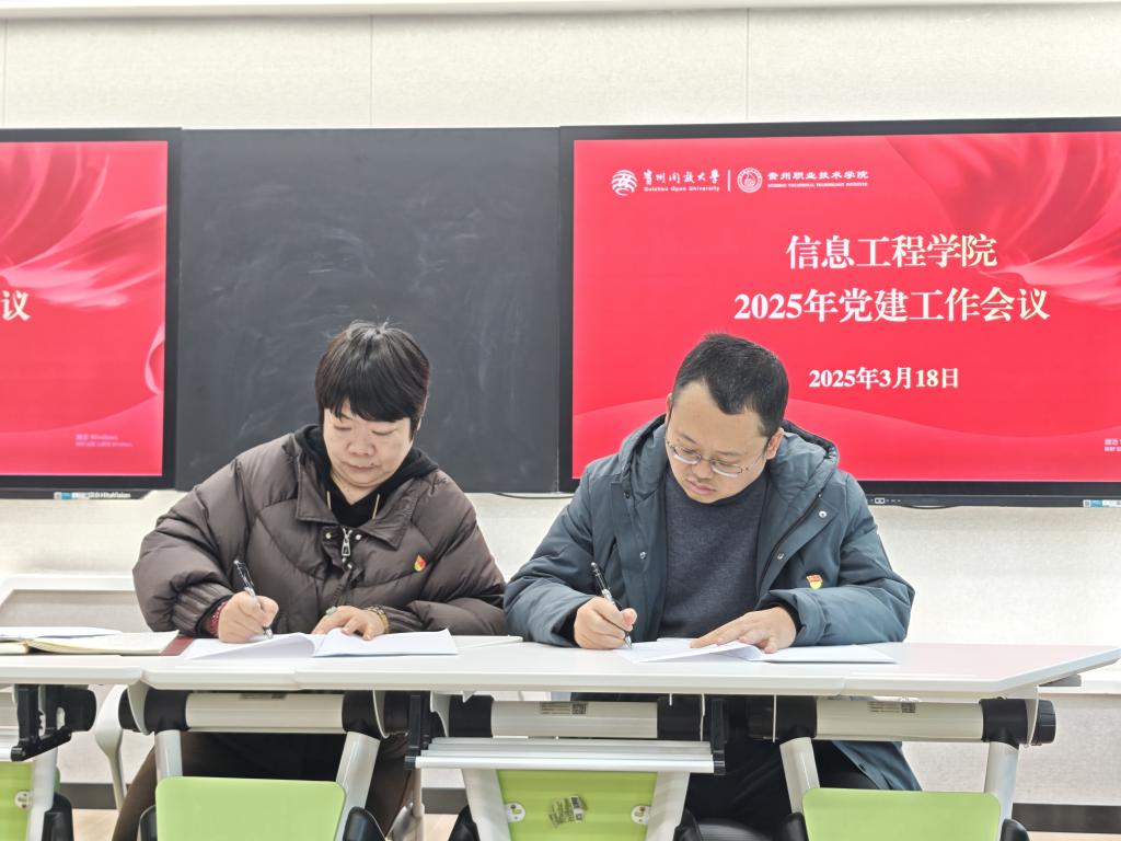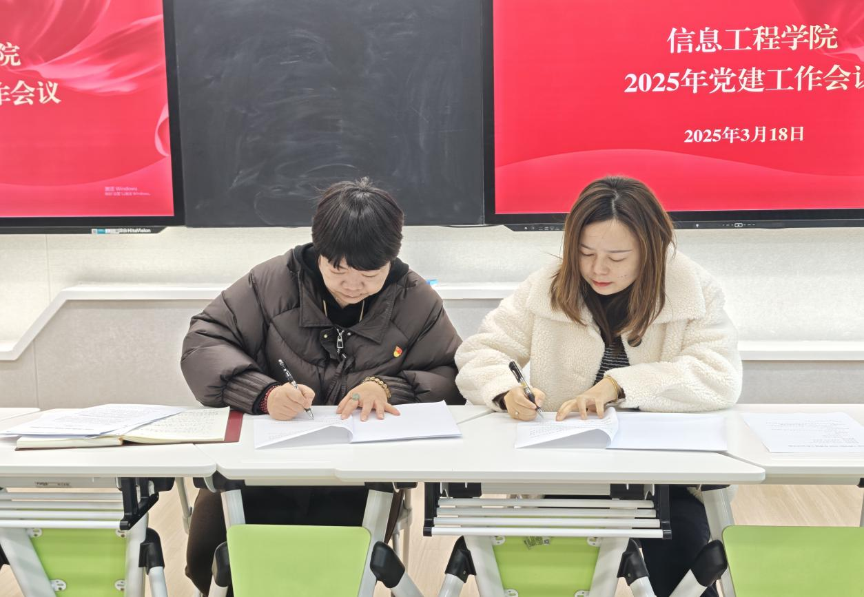 会议“第一议题”学习了习近平总书记重要文章《健全全面从严治党体系》。学院党委副书记(主持工作)谭永凤同志传达学习了学校2025年党建工作会议精神,并对学院2025年党建工作做了安排部署。随后,谭永凤同志与辅导员学生党支部、软件与大数据教研室党支部、网络教研室党支部、人工智能教研室党支部分别签订了《2025年信息工程学院党建工作责任书》。