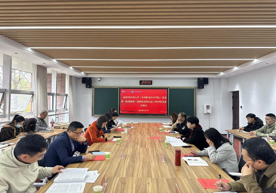 根据贵州开放大学(贵州职业技术学院)党委巡察工作领导小组的部署,2025年4月7日,学校党委第三轮巡察第二巡察组巡察信息工程学院党委工作反馈会在知行楼三楼多功能会议室召开。学校纪委副书记杨慧颖,校党委第二巡察组组长刘婕,副组长余红心及其他巡察组成员出席会议。信息工程学院党委领导班子成员、全院教职工、学生代表参加会议,会议由信息工程学院党委副书记(主持工作)谭永凤同志主持。