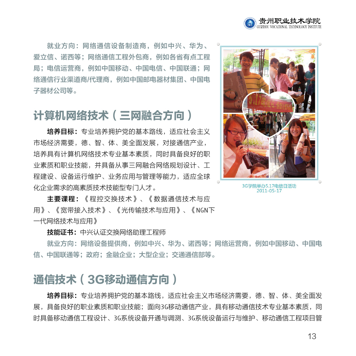 培养目标:专业培养拥护党的基本路线,适应社会主义市场经济需要,德、智、体、美全面发展,对接通信产业,培养具有计算机网络技术专业基本素质,同时具备良好的职业素质和职业技能,并具备从事三网融合网络规划设计、工程建设、设备运行维护、业务应用与管理等能力,适应全球化企业需求的高素质技术技能型专门人才。