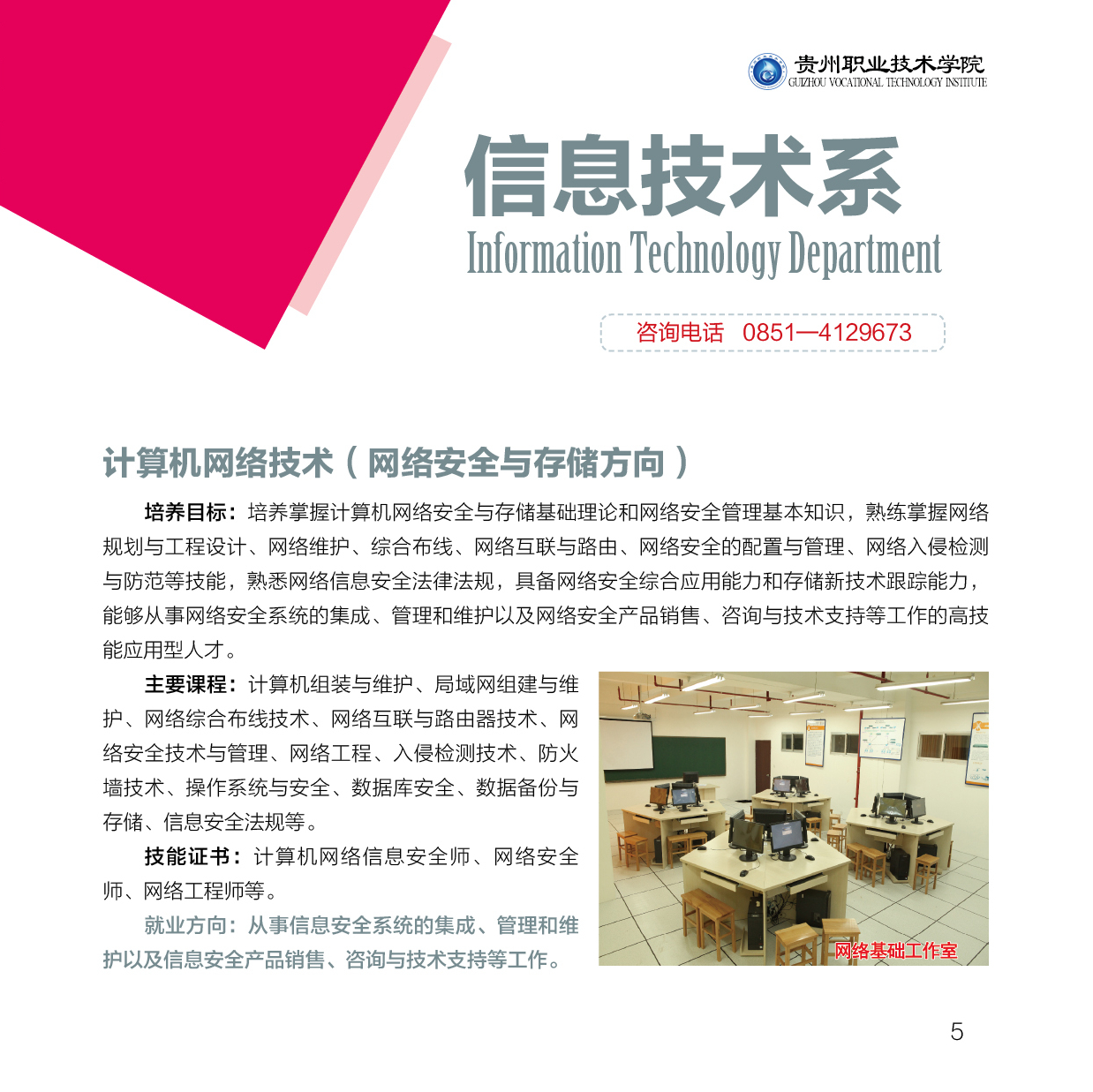 主要课程:计算机组装与维护、局域网组建与维护、网络综合布线技术、网络互联与路由器技术、网络安全技术与管理、网络工程、入侵检测技术、防火墙技术、操作系统与安全、数据库安全、数据备份与存储、信息安全法规等。