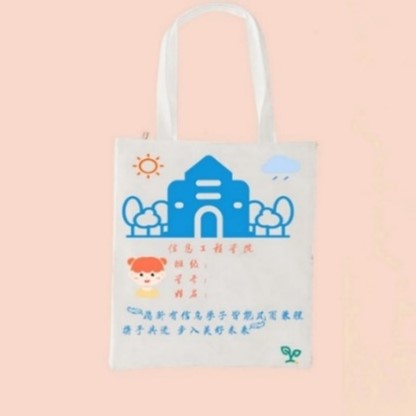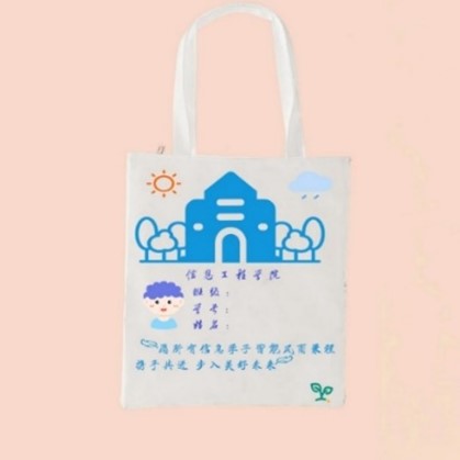 寓意:帆布左右两上角分别有太阳和雨是为了突出我们有在学院的庇护下茁壮成长,有学院为我们遮风挡雨,我们才能专心求学。为了突出本学院的主题,特地突出了本学院院徽,整体使用了简约蓝,在院徽的下面所使用的双生花为了突出在学校的精心呵护下,我们学信息学院才得以发展,院徽下是咱们的校训,无时无刻提醒广大学子们要不忘初心,奋勇向前。