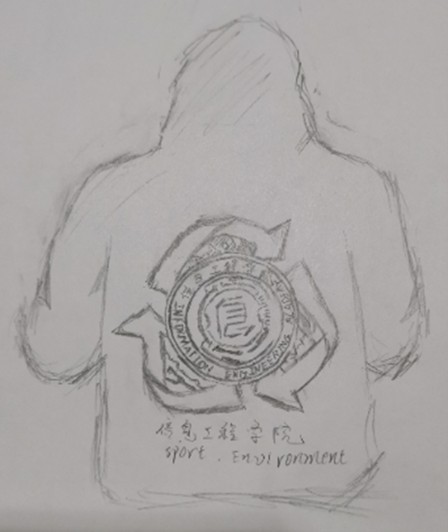 寓意:前面的两个袖子和肚子位置的接力赛提观环保与健康的含义左胸口处的院徽由wife的图标和信息工程学院的字母缩写构成体现信息时代;背面由院徽章和运动与环境两个英语单词构成,体现了健康生活,保护环境,锻炼身体的理念,拥有健康生活,积极向上的态度,以及团结一心的品格!