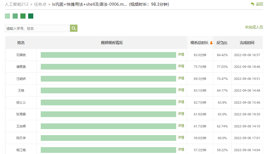 此外,为了方便学生课后复习,信息学院全体教师通过腾讯会议录制功能,实现线上教学全程录屏,课后及时发送到学生QQ群便于学生课后回溯学习。部分教师还将自己录制的实操视频、理论知识点微课以及腾讯会议录屏内容上传到教学平台,在学习通设置任务点闯关模式,帮助学生课后进一步复习巩固知识点,教师根据学习通统计数据了解学生对知识点的学习次数,结合学生观看视频的反刍比全面了解学生在课后对知识点的学习时长,充分掌握学生的学习情况,有针对性地调整下一次课程的教学内容。