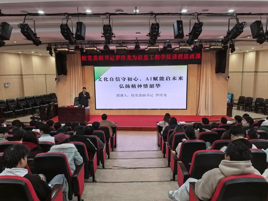 为深化青年学生理想信念教育,4月1日,校党委副书记罗玲龙以“文化自信扬国粹,AI科技创未来,青春奋斗谱新篇”为主题,为信息学子带来一堂兼具思想深度与实践温度的思政课,激励青年学子以文化自信为根基,用科技力量书写时代答卷。