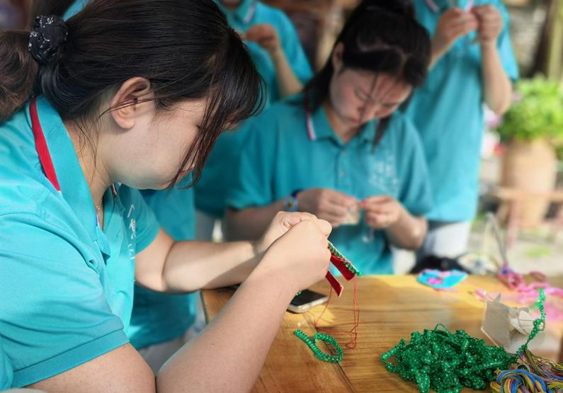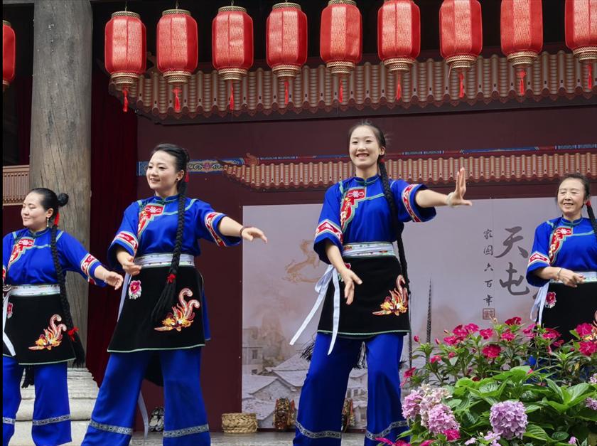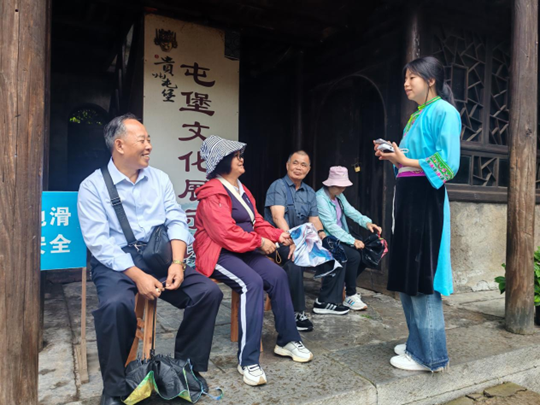 贵职学子身着屯堡服饰化身“文化代言人”,为老年游客讲解建筑历史与民俗故事,并参与地戏、刺绣等非遗体验,深化对文化的理解。同时,拍摄宣传短片,以年轻化视角展现屯堡魅力,用行动诠释文化传承担当。