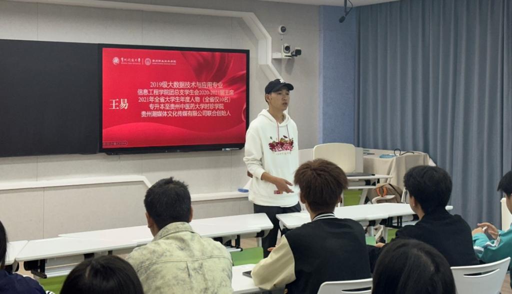 王易同学在校期间曾任信息工程学院团总支学生会主席、荣获2020-2021学年全省大学生年度人物,而后专升本至贵州中医药大学,目前创业成立了贵州潮媒体文化传媒有限公司。