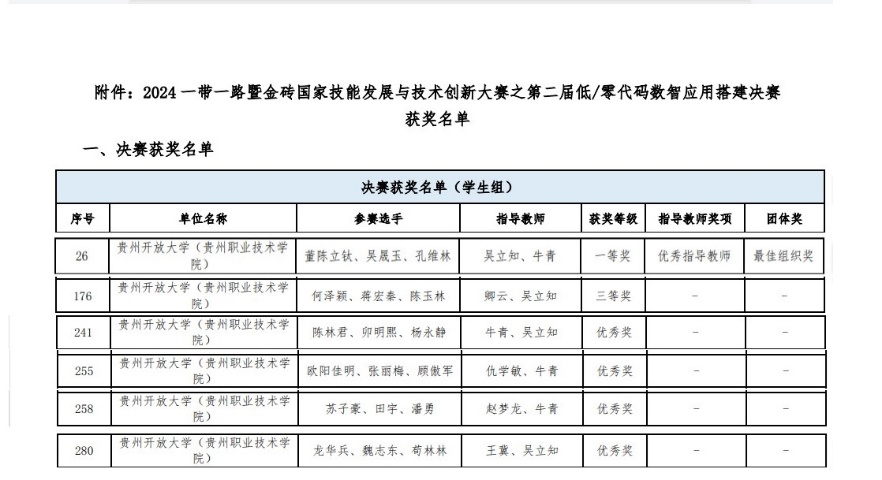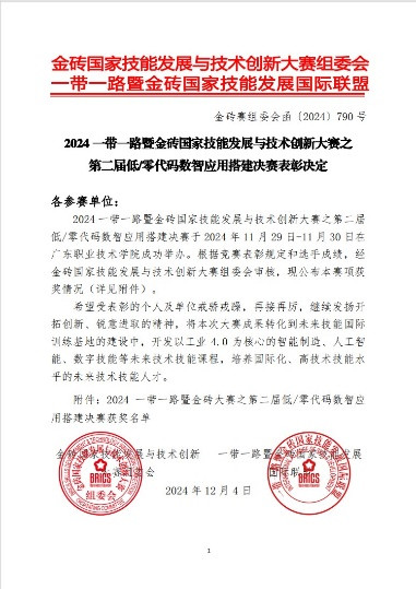 2024年11月30日,由金砖国家工商理事会中方理事会、一带一路暨金砖国家技能发展国际联盟、中国科协“一带一路”暨金砖国家技能发展与技术创中心主办的“2024 一带一路暨金砖国家技能发展与技术创新大赛之新培训第二届低/零代码数智应用搭建决赛”成功举办。信息工程学院大数据技术专业6支学生参赛队经过初赛选拔进入决赛,并获高职组一等奖1项,三等奖1项,优秀奖4项,我校获得“最佳组织奖”。